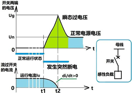 注意1:随着负载电流(实际上就是电弧电流)不断减小,电流对时间的变化率反而越来越大,并且在接近于 t2 时刻,电流对时间的变化率di/dt达到最大值,电感的反向电动势电压也达到最大值,我们把它叫做过电压。